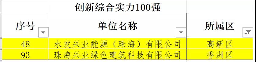 近日,珠海市科技創新局對2021年珠海市高新技術企業百強名單進行公示,中國水發興業能源集團有限公司旗下權屬公司再度入榜:水發興業能源(珠海)有限公司入選經濟貢獻100強(排名51)和創新綜合實力100強(排名48);珠海興業綠色建筑科技有限公司入選創新綜合實力100強(排名93)。