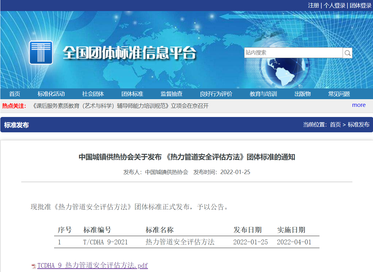 盾安(天津)節能系統有限公司參與編制的團體標準T/CDHA 9-2022《熱力管道安全評估方法》近日正式發布,于2022年4月1日起正式實施。